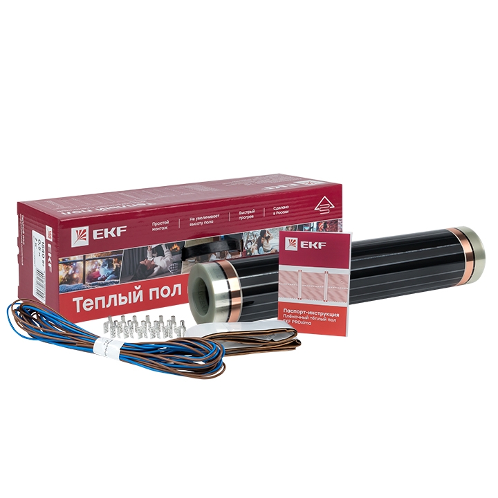 Пленочный теплый пол EKF применяется для сухого монтажа без стяжки не только при капитальном ремонте, но и при косметическом. Толщина пленки -0,338 мм. Обеспечивает быстрый и легкий монтаж. Идеально подходит для укладки под ламинат, паркетную доску, мягкое напольное покрытие: линолеум, ковролин. Инфракрасный пленочный теплый пол состоит из следующих элементов. Полосы углеродного материала шириной около 1,5 см соединены между собой при помощи медных шин с серебряным покрытием, которые и проводят электрический ток. Нагревательный элемент заламинирован с двух сторон плотным полимером, который не задерживает инфракрасное излучение и обеспечивает отличную защиту от попадания влаги, пробоев и возгорания.