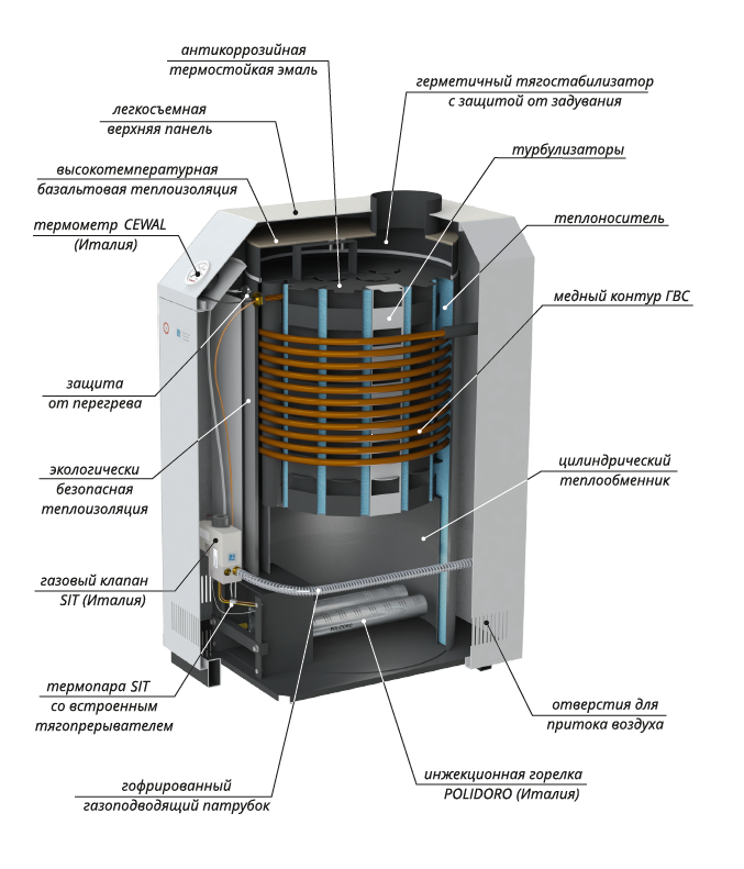 Оснащение оригинальными компонентами газогорелочного устройства и автоматикой безопасности итальянского концерна SIT, а также инжекционной микрофакельной горелкой POLIDORO