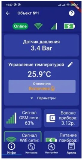 К прибору напрямую подключается датчик давления. Можно в режиме онлайн контролировать давление в системе отопления. Также можно задавать тревожные пороги давления, при которых вам на телефон будут приходить тревожные сообщения.