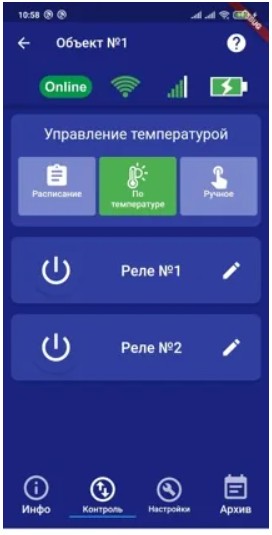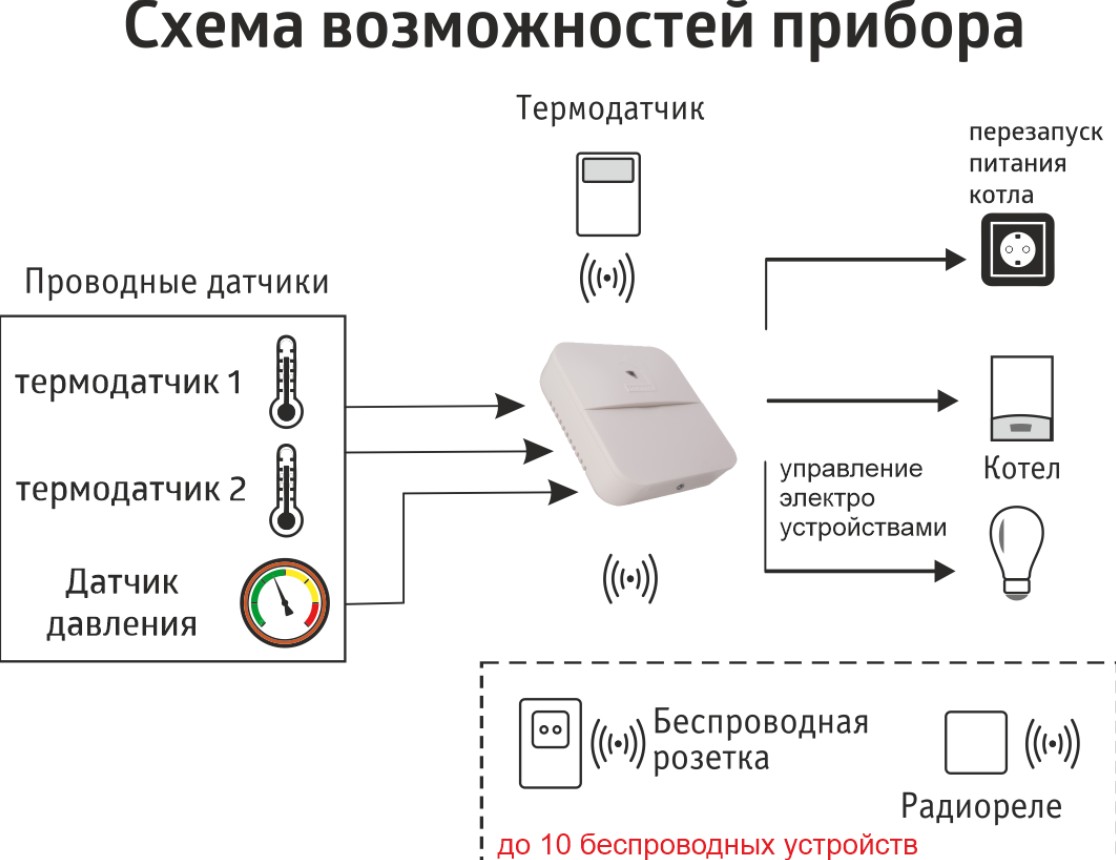 В приборе 2 силовых реле (сухие контакты) позволяют управлять котлом или любыми электроприборами до 2,2 КВт (~220В х 10А) с телефона (освещение, полив, электрообогреватели, тёплые полы и т. д.).