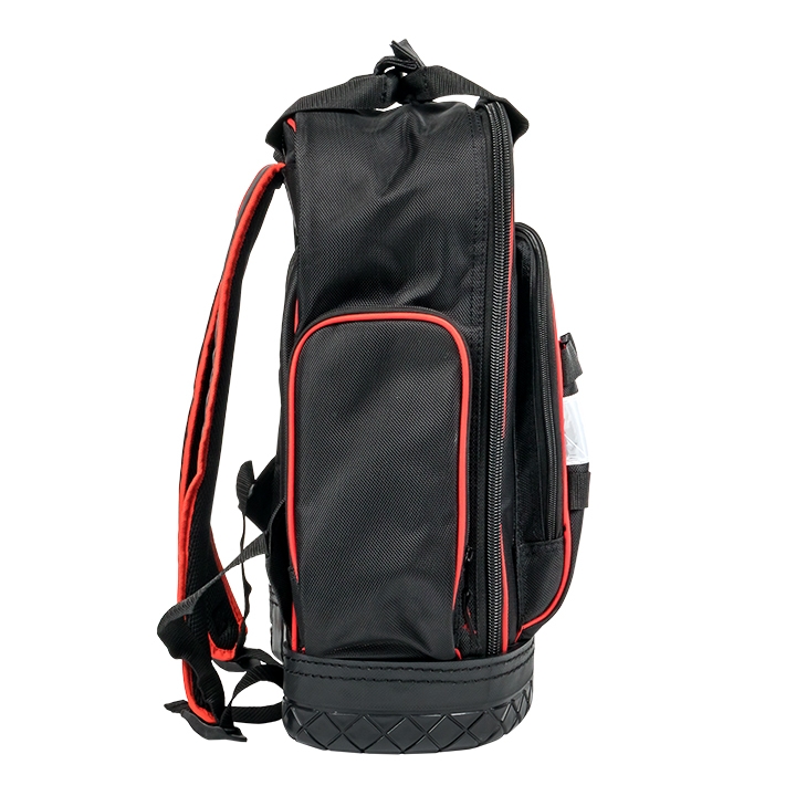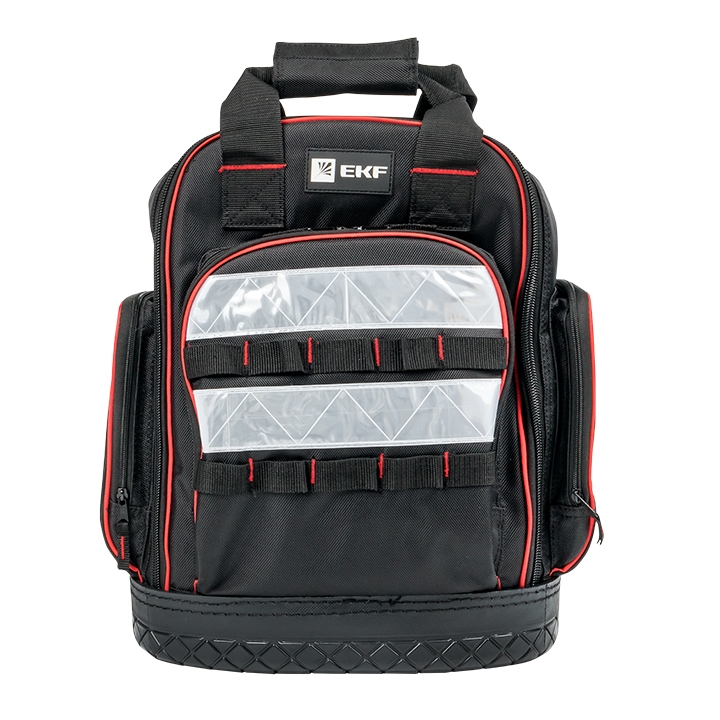 Рюкзак монтажника универсальный с резиновым дном С-07 EKF для удобного и комфортного перемещения инструмента к месту выполнения работ. Мягкие анатомические вставки на спинке и лямках рюкзака для комфорта. Усиленная ручка для переноски, способная выдержать большой вес инструмента с тканевой застежкой, уменьшающей давление на руку (до 25 кг) Двойная ручка способствует распределению груза по центру масс, что снижает риск обрыва ручек и позволяет более комфортно переносить большие веса. Светоотражающие элементы на внешней стороне рюкзака для безопасности при движении в темное время суток. Жесткое масло- и водостойкое дно усиленной конструкции, позволяет выдерживать значительные ударные нагрузки. Просторное внутреннее пространство с карманами для инструментов. Предусмотрен отдельный карман для мультиметра.
